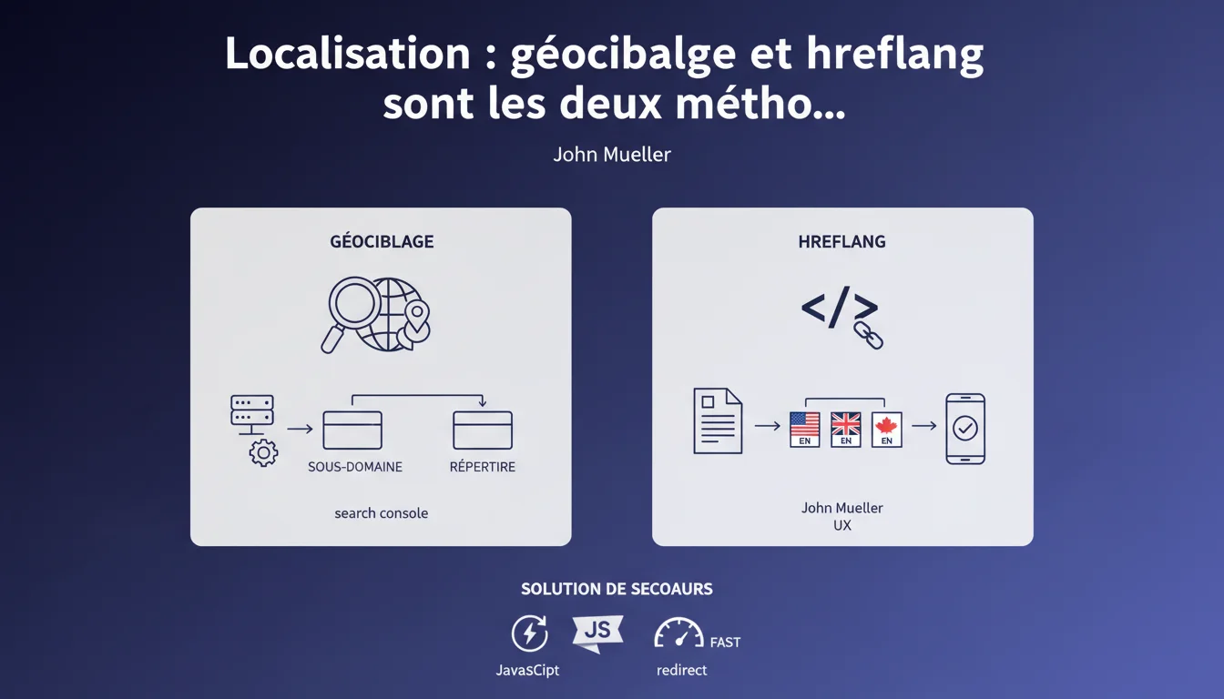 Google confirms two main approaches for targeting English-speaking content by country: geotargeting through Search Console (subdomains or directories) and hreflang tags (page level). JavaScript can serve as a fallback, but it remains a secondary solution. The two methods are not mutually exclusive — they address different technical needs.