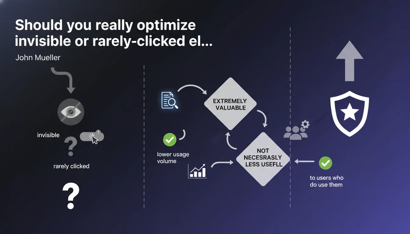 Google asserts that low-visibility or rarely-used page features are no less valuable for that reason. Even if a section generates minimal interactions, it can deliver significant value to users who need it. Concrete takeaway: don't sacrifice your page's functional richness for the sake of raw engagement metrics.