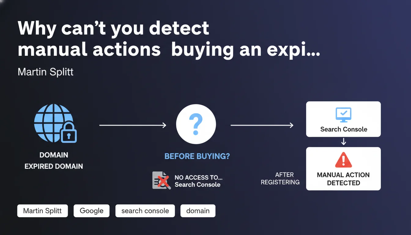 Google could technically expose this data — after all, manual actions are documented in its systems. But the company chooses not to, probably to prevent this information from becoming a market signal in domain trading. Result: you buy at your own risk.