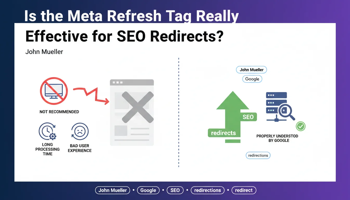 John Mueller recently clarified this position by confirming on Twitter that Google does understand and effectively processes this tag as a functional redirect. However, two major limitations persist: a degraded user experience and longer processing time by Google's crawlers.