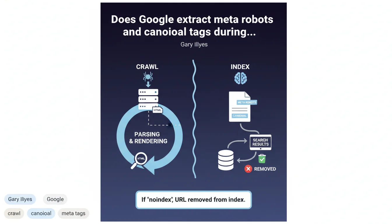 Google extracts meta robots noindex and rel canonical tags during the indexing phase, not during the initial crawl. These directives are read when the content is parsed and rendered. In practice: a page can be crawled multiple times before Google detects and applies a noindex directive.