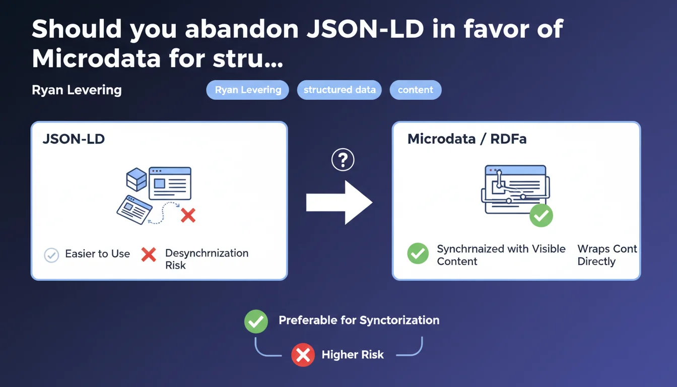 Google acknowledges that Microdata and RDFa remain better synchronized with visible content than JSON-LD. JSON-LD, while simpler to implement, presents an increased risk of desynchronization between structured data and the content actually displayed on the page. An admission that puts official recommendations favoring JSON-LD for years into perspective.