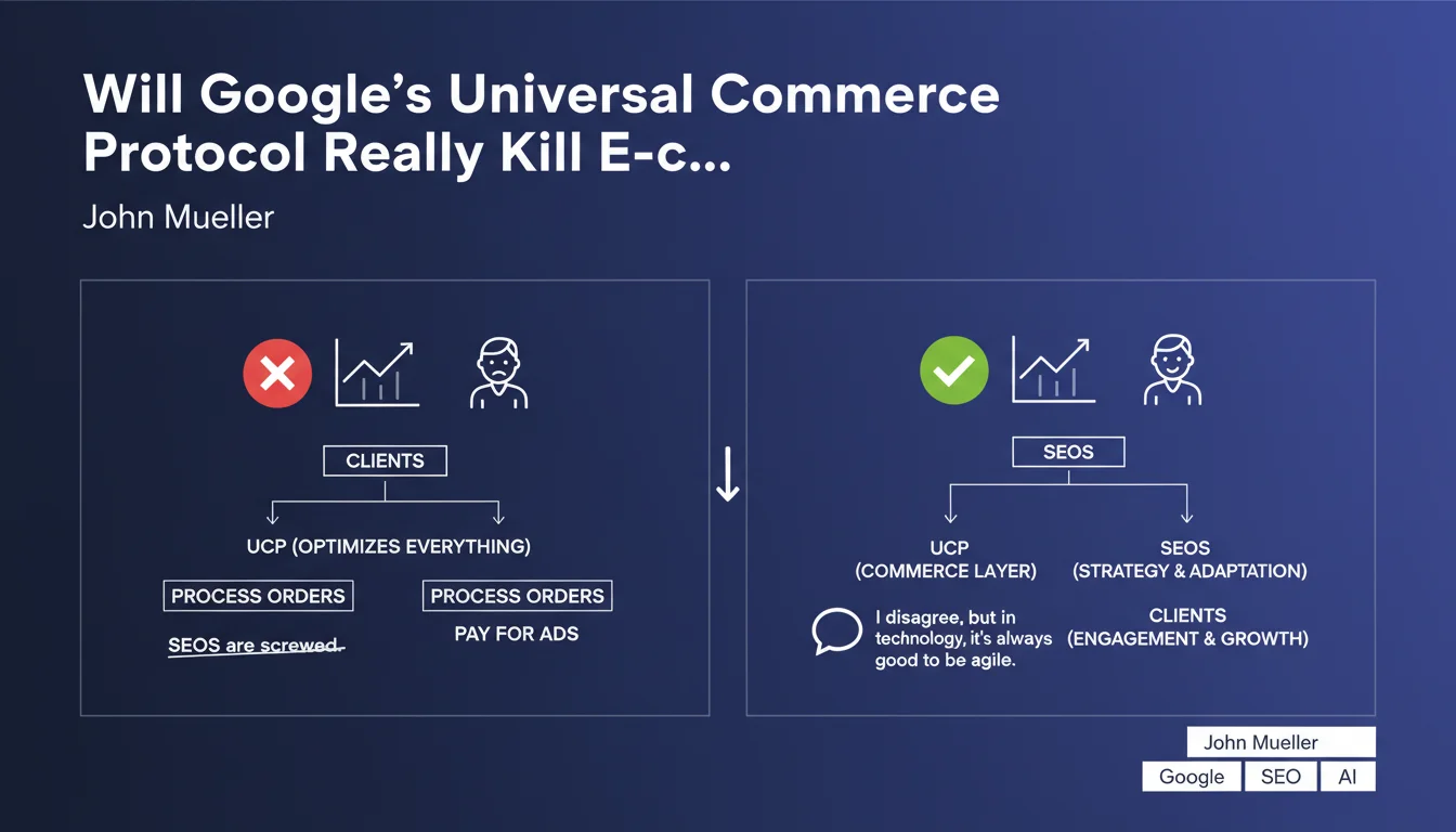 The real question is not "will SEO die?" but rather "how do we adapt our SEO strategies to integrate these new channels?". The agility mentioned by Mueller is key: we must understand UCP, test its possibilities, while maintaining a solid SEO presence across all channels.