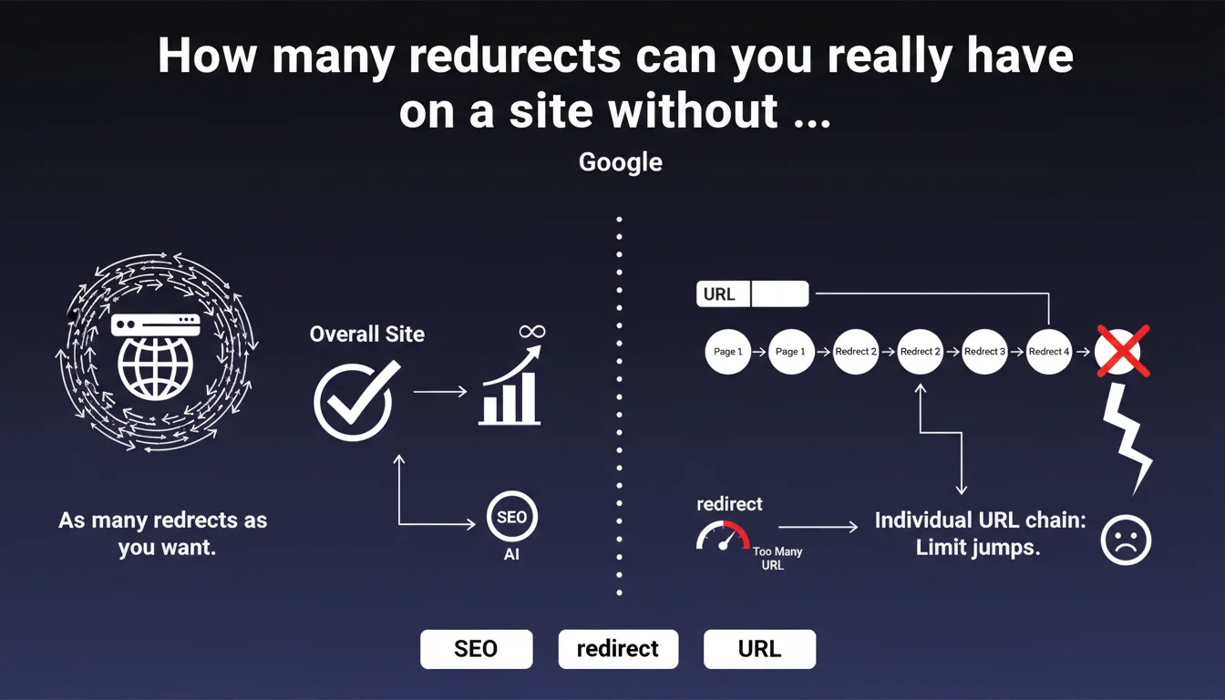 Google distinguishes between two concepts that are often confused here. The total number of redirects on a site refers to all the URLs that redirect to other pages — whether that's thousands or hundreds of thousands.