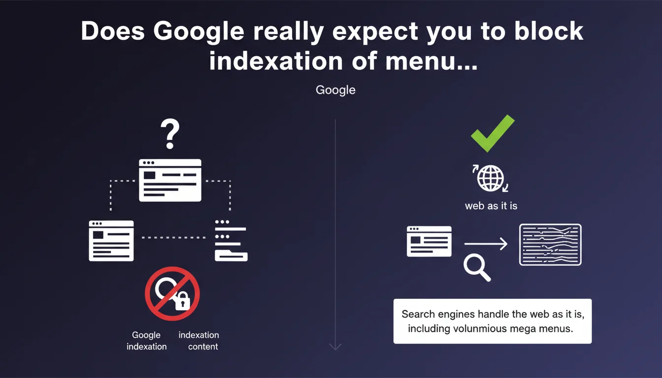 Google says it handles voluminous menus, but this does not mean they have no impact. A mega menu with 300 duplicate links across 10,000 pages generates 3 million occurrences of those same URLs in the index.