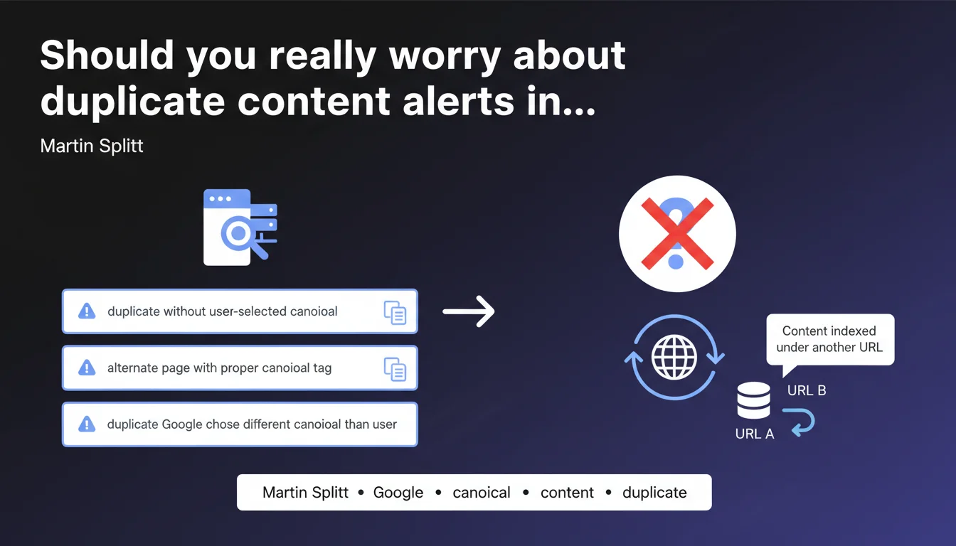 Google states that the statuses 'duplicate without user-selected canonical', 'alternate page with proper canonical tag' or 'duplicate Google chose different canonical than user' in Search Console are not issues. These messages simply indicate that Google has indexed the content under a different URL than the one you would have preferred. In other words: no need to panic, but vigilance remains necessary.