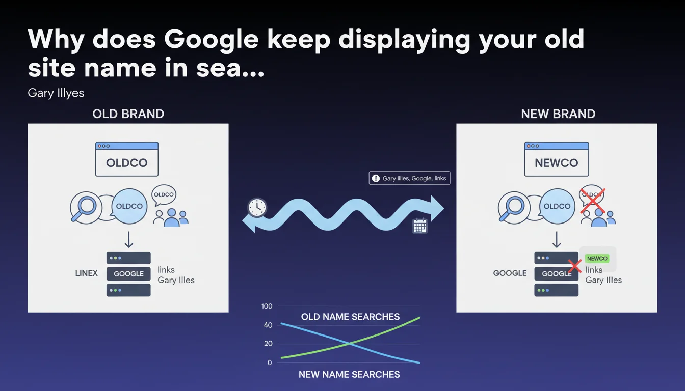 He only discusses "user searches" but ignores the negative business consequences. If your old name is associated with a scandal, bankruptcy, or hostile acquisition, maintaining this link in search results can destroy your repositioning strategy. Google makes no distinction between "nostalgic old name" and "toxic old name".