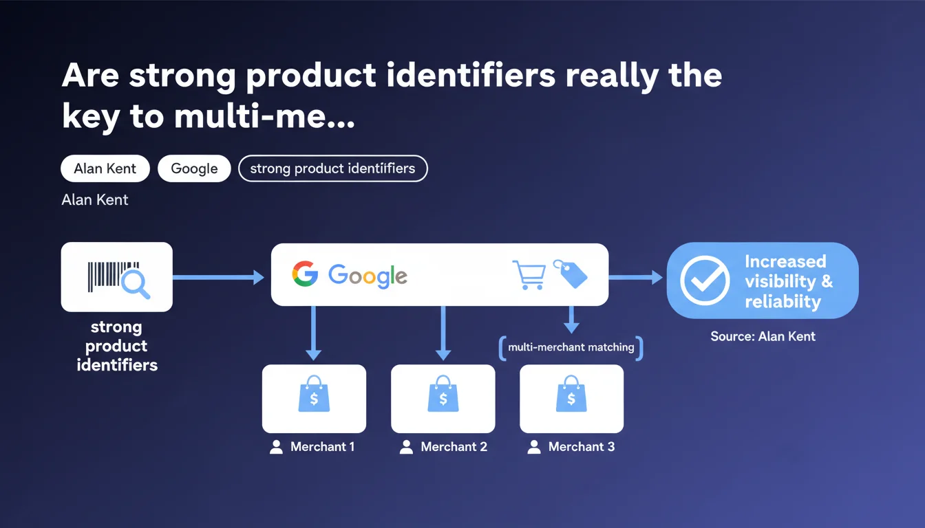- Strong identifiers = reliable matching: GTIN, EAN, UPC enable unambiguous multi-merchant grouping