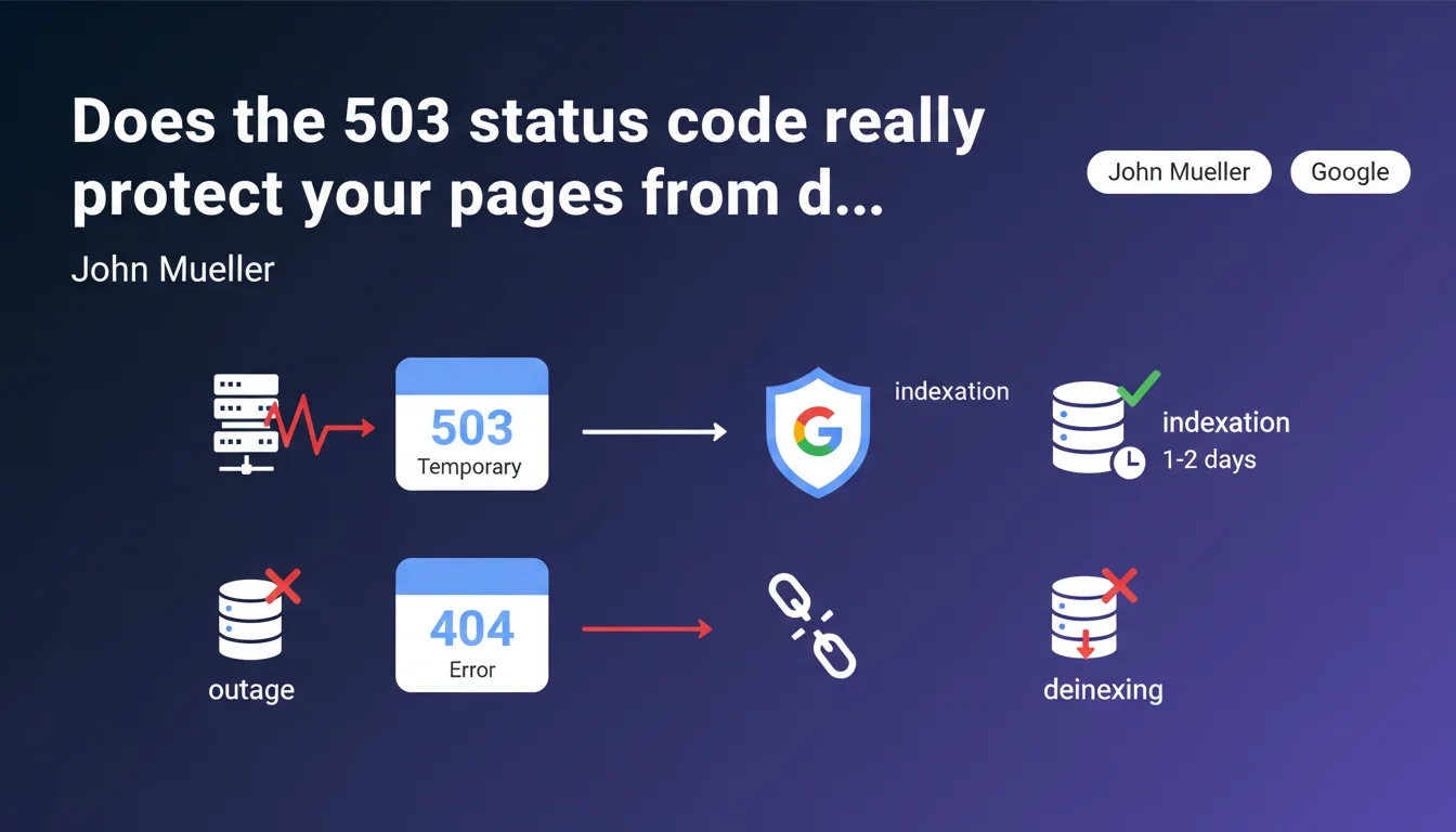 Mueller mentions "one or two days" as a safety window. Beyond that, Google begins to doubt the temporary nature of the outage and may decide to remove pages from the index despite the 503.