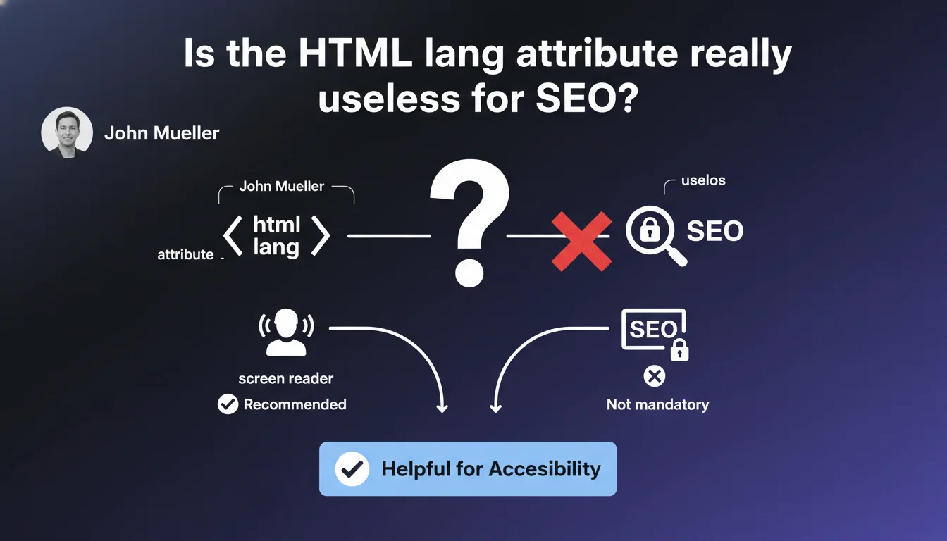 John Mueller confirms that the HTML lang attribute is not mandatory for SEO, but remains recommended for screen reader accessibility. Google can identify a page's language without this attribute, but its presence facilitates the user experience for certain audiences.