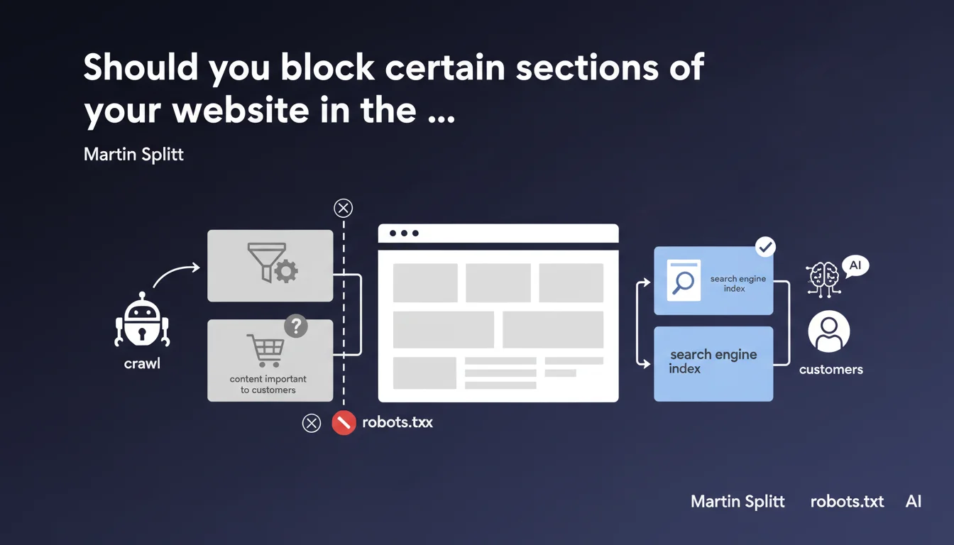 Google officially recommends blocking via robots.txt certain parts of your site that consume crawl budget without delivering SEO value: complex filter pages, content relevant to customers but not to search engines. This practice optimizes the allocation of crawl resources toward strategic pages.
