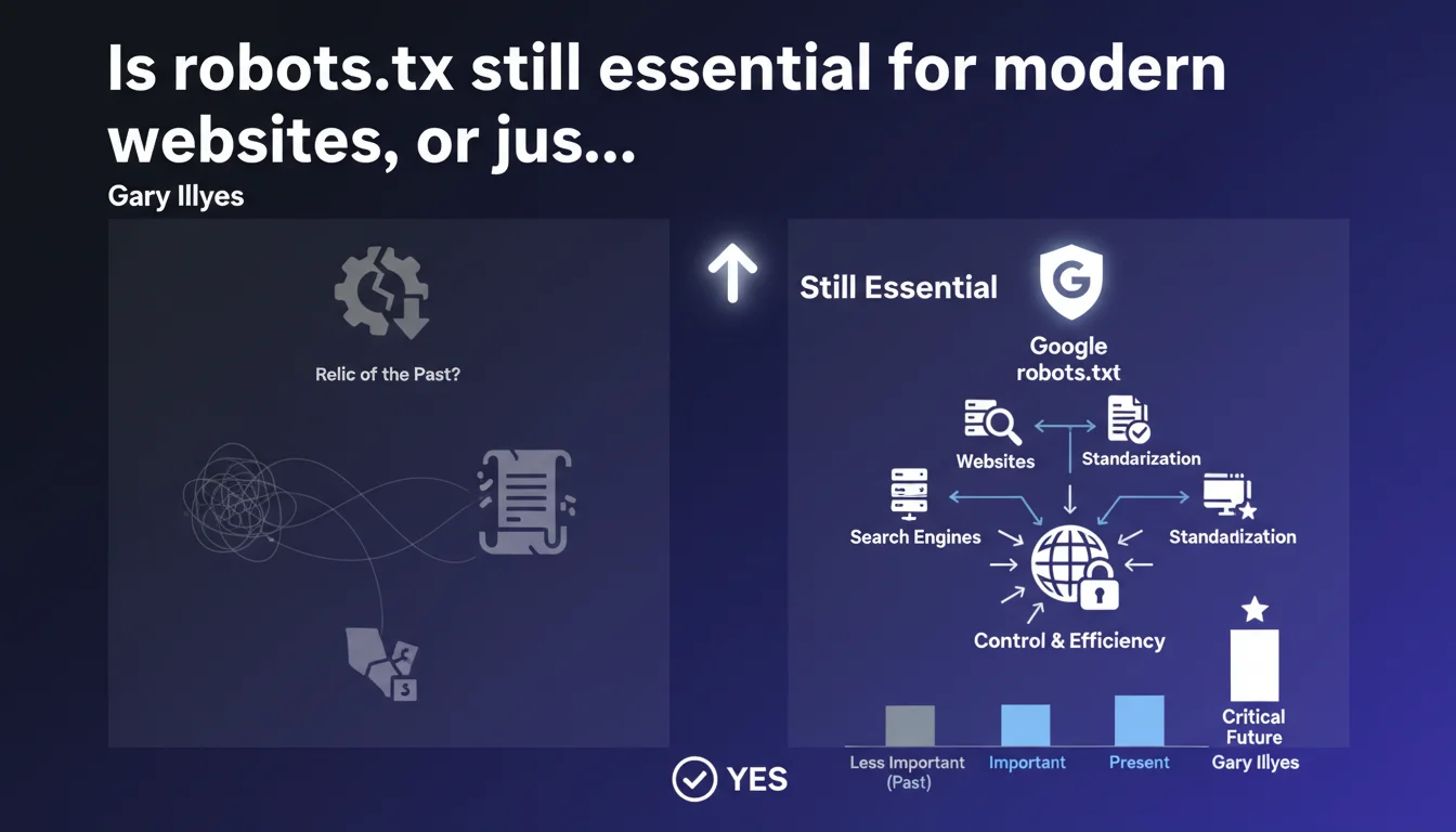 The standardization Gary mentions refers to the passage of robots.txt to RFC 9309, which formalizes a protocol used for decades. Concretely? One file, clear syntax, and all crawlers that respect the protocol follow the same rules. No need to manage exceptions by engine.