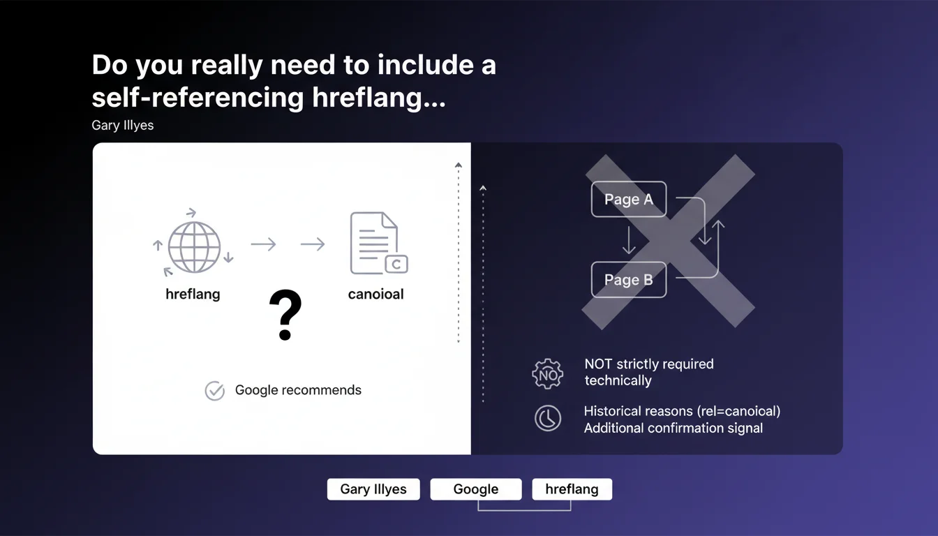 [To verify] Gary doesn't specify whether this tolerance applies to hreflang sitemaps as well. My field experience suggests that self-reference remains more critical in sitemaps than in header HTML tags, but Google has never officially confirmed this distinction.