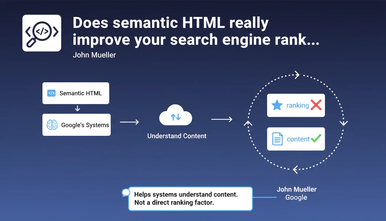 Mueller doesn't say semantic HTML is useless. He says it's not a direct ranking lever. A crucial distinction: a technically clean site makes the crawler's job easier, reduces interpretation ambiguities, and can indirectly improve user experience (accessibility, loading time if the DOM is better structured).