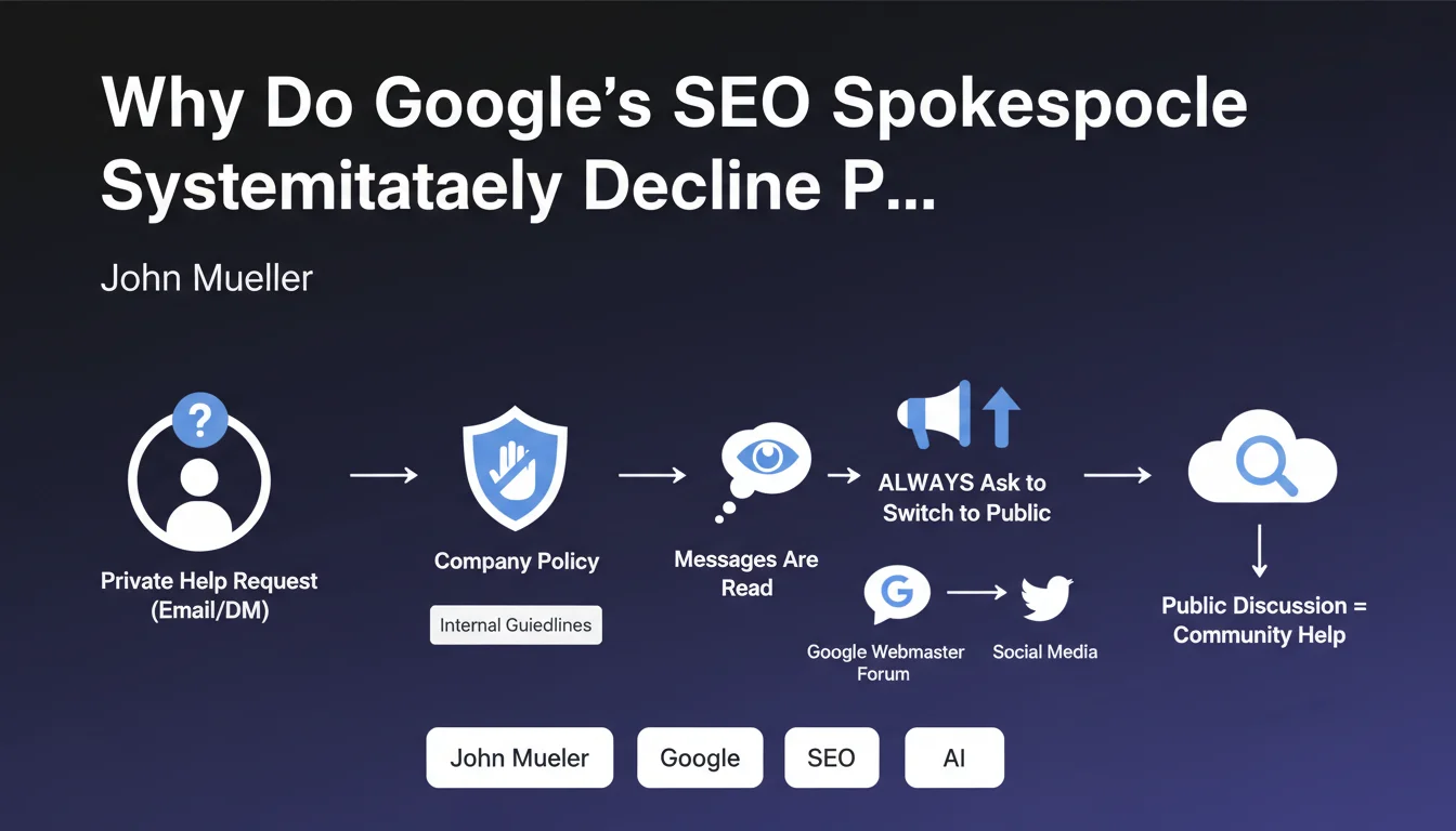 This position is explained by several reasons: avoiding any preferential treatment, guaranteeing fairness between all site owners, and maintaining transparency in exchanges. Spokespeople systematically encourage asking questions in public, whether on social networks or official webmaster forums.