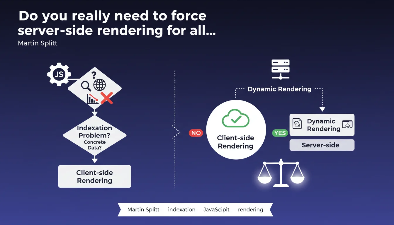 Splitt is right to say you shouldn't deploy SSR on principle. But he oversimplifies somewhat. The real issue is rendering speed and JavaScript code quality. If your site takes 8 seconds to display content on the client side, Googlebot will struggle — even though it technically knows how to handle JS.