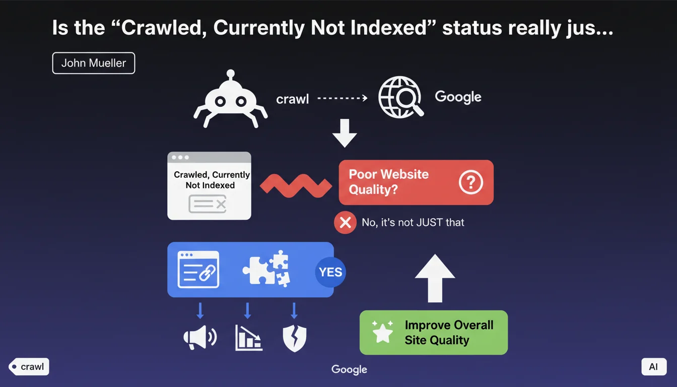 Google states that the 'Crawled, Currently Not Indexed' status generally reflects a lack of confidence in the overall quality of the website. The official recommendation: significantly improve the quality of the entire site, not just the affected pages. Contrary to popular belief, it's not just a technical issue or crawl budget problem.