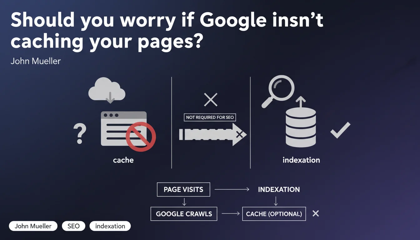 Mueller insists: cache is not required for SEO. If your page appears in the SERPs, it means it's indexed. End of story. The absence of cache should not trigger a red alert in your technical audit.