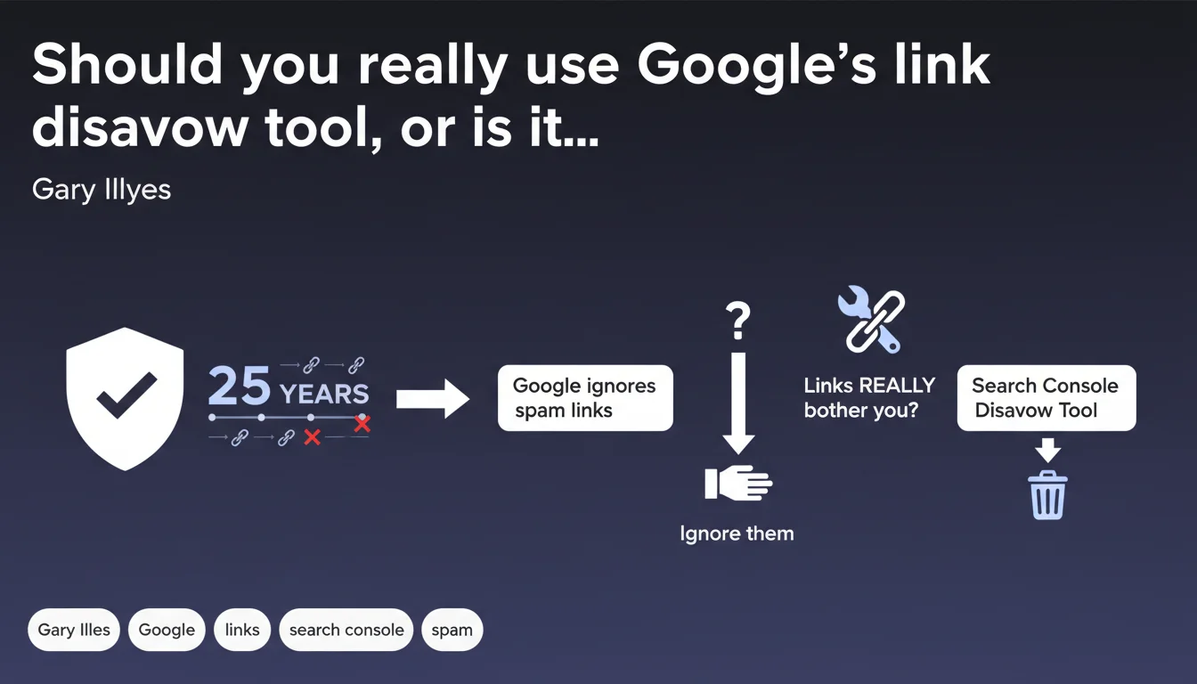 Google has been managing spam links for 25 years and knows how to ignore them automatically. The Disavow Links tool in Search Console should only be used if spam links personally bother you — otherwise, let Google do its job. Clear message: stop obsessing over systematic disavowal.