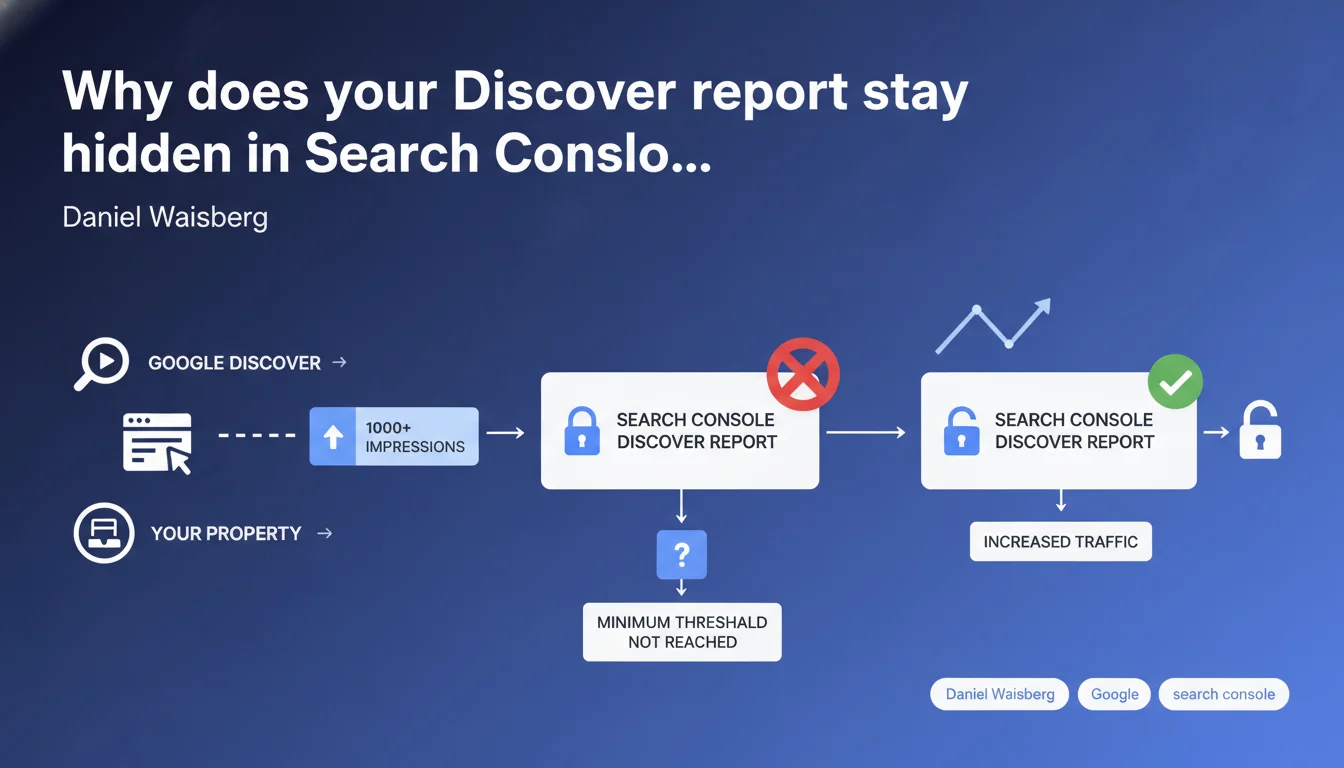 Google enforces a minimum impressions threshold in Discover before the report appears in Search Console. No visible data doesn't necessarily mean zero Discover traffic — it just means the volume is too low to trigger the report display. This distinction changes how you should interpret a missing report.