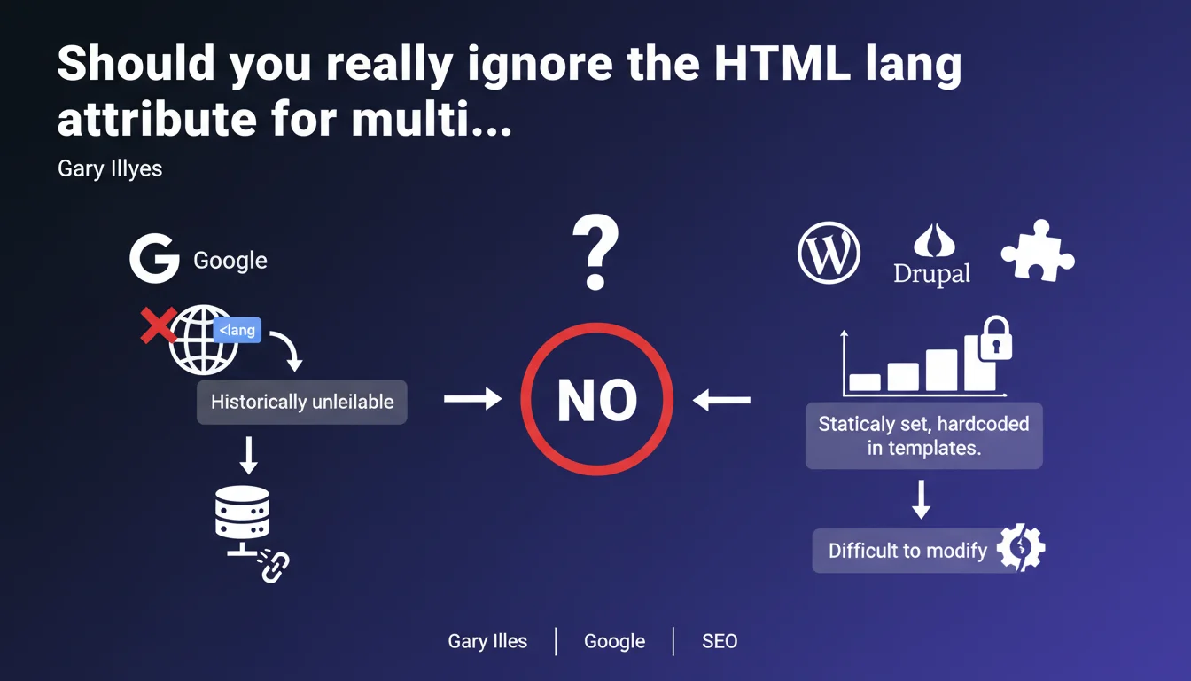 Gary Illyes' statement is unambiguous: the lang attribute of HTML tags is useless for SEO. Google historically discarded it because this signal proved too noisy and unreliable.