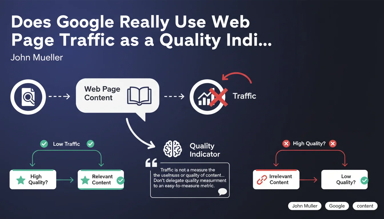 Google has its own metrics to evaluate content quality, based on semantic analysis, relevance, expertise, and user experience. Traffic volume is a consequence of multiple factors (topic popularity, seasonality, marketing strategy) that have no connection with the intrinsic value of the content.