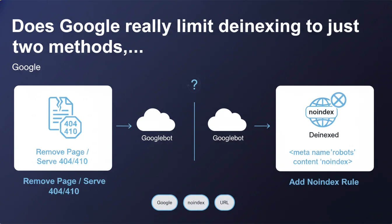 Google claims there are only two effective ways to deindex URLs: returning an HTTP 404/410 status code or using the noindex directive while allowing Googlebot to crawl the page. This deliberate simplification overlooks other technical methods and raises questions about their real effectiveness compared to the two officially recommended options.