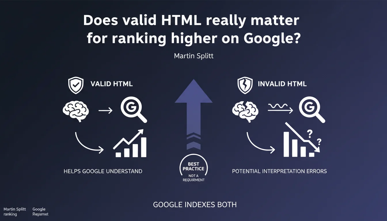 Google indexes pages even with invalid HTML, but prefers clean code to avoid interpretation errors. Valid HTML is not a technical requirement, but a strong recommendation to maximize crawl and indexation reliability. Practically speaking: a site can rank with messy code, but it takes unnecessary risks.