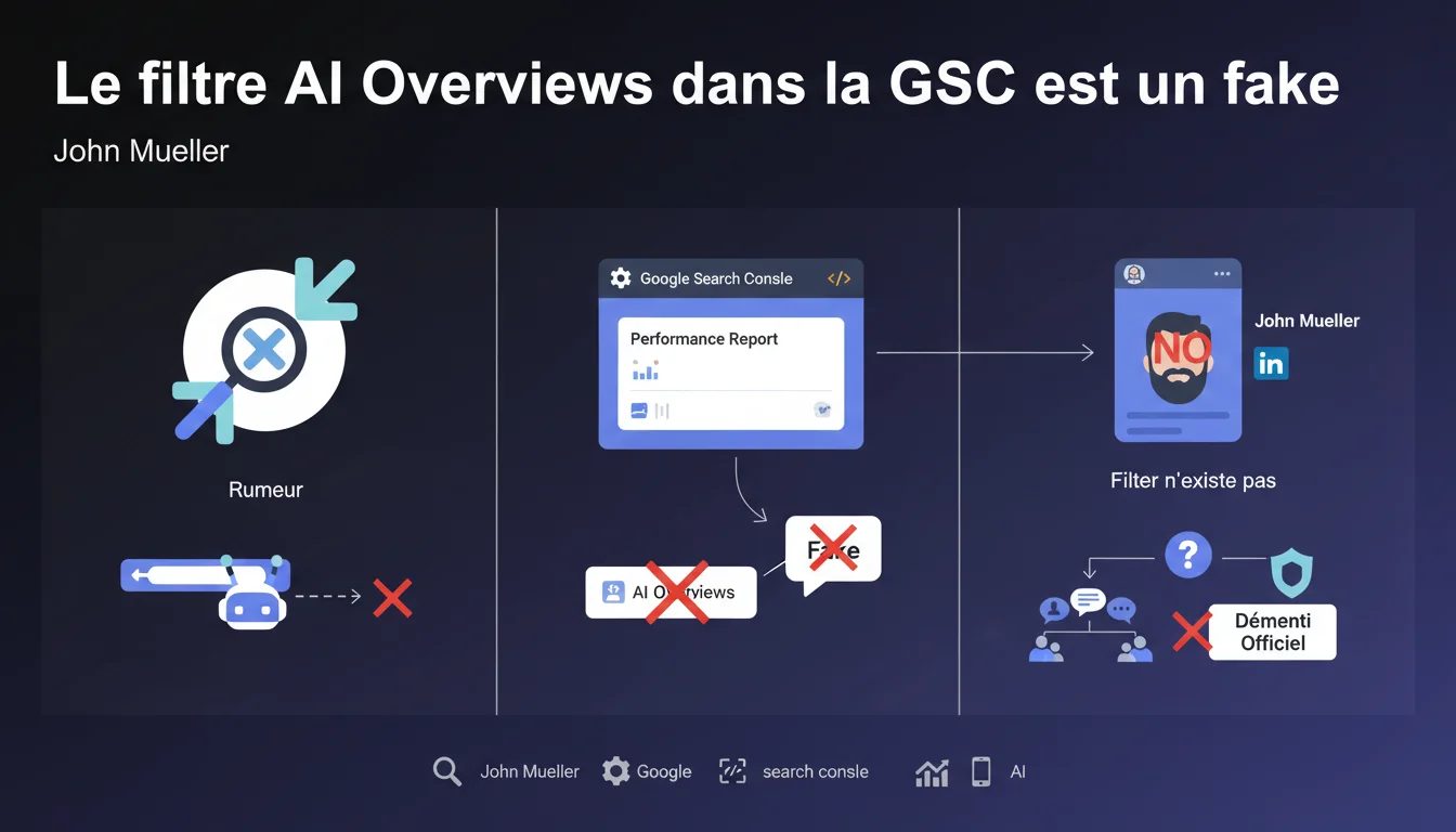 Non, Google Search Console n’a pas ajouté de filtre dédié aux AI Overviews dans le rapport de performance, contrairement à une rumeur très r...