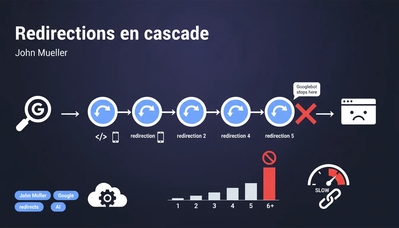 John Mueller a indiqué sur Reddit qu'il fallait éviter les redirections en cascade et notamment plus de 5 redirections successives sur un si...